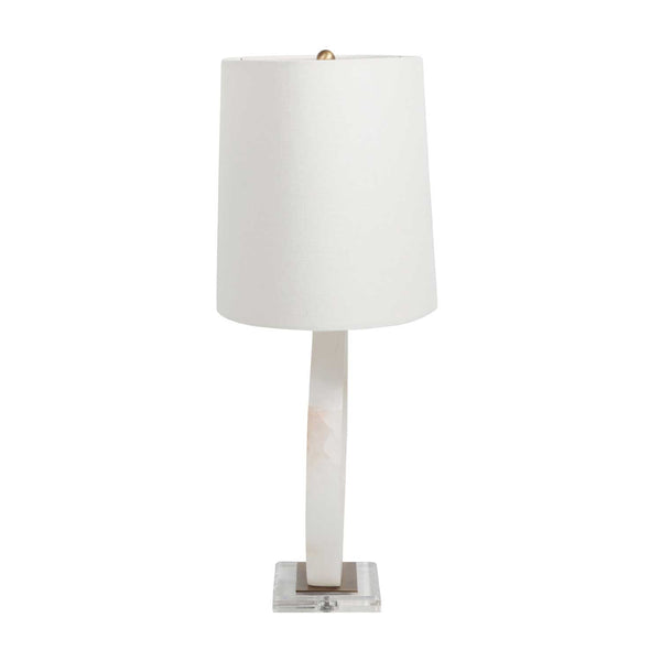 A smooth ring of alabaster encloses a central antique brass ring for the simple yet elegant Elle Table Lamp. A white oval shade tops this white and gold toned accent lamp.